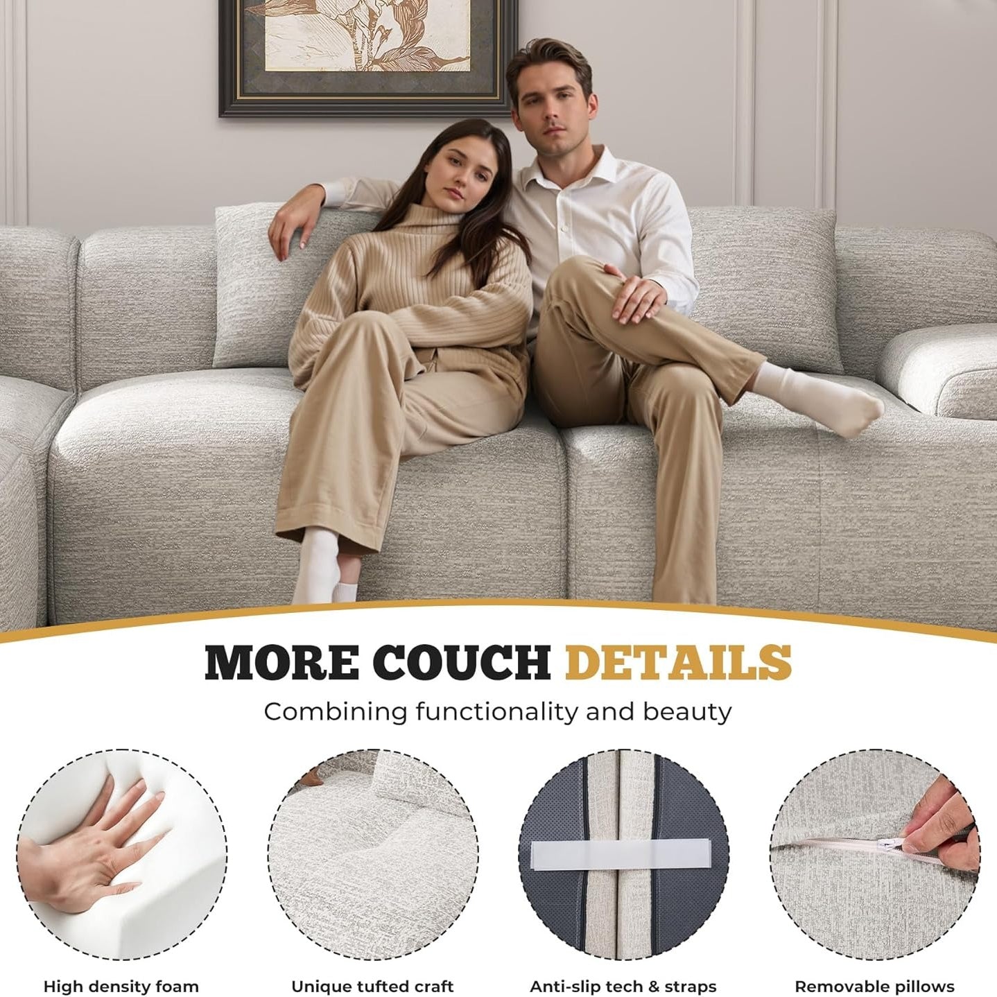 No squeaky frames. No sagging. Just pure comfort. Built entirely with **30D high-density foam**, this sofa delivers a perfect balance of softness and support. Thanks to **fast-rebound technology**, it keeps its shape for years — no matter how often you sink in. 💪