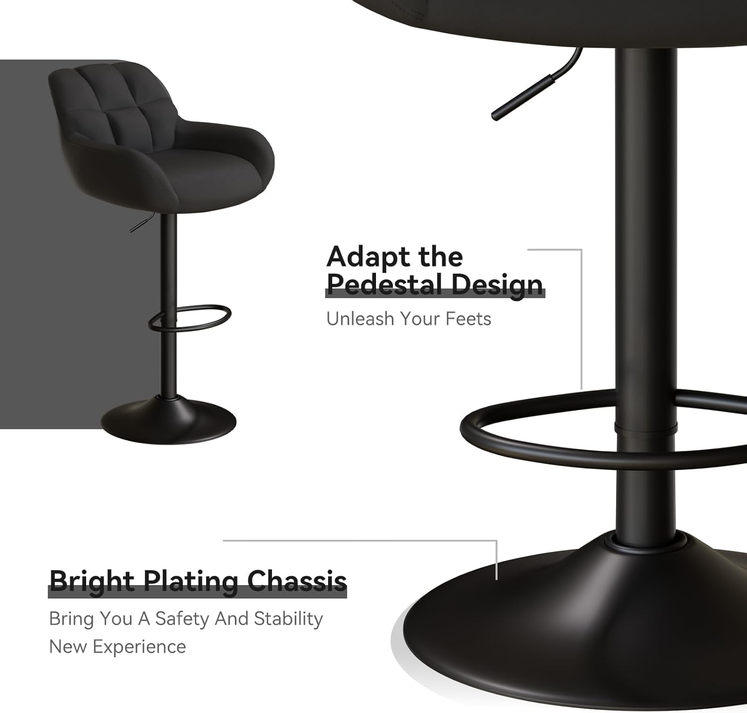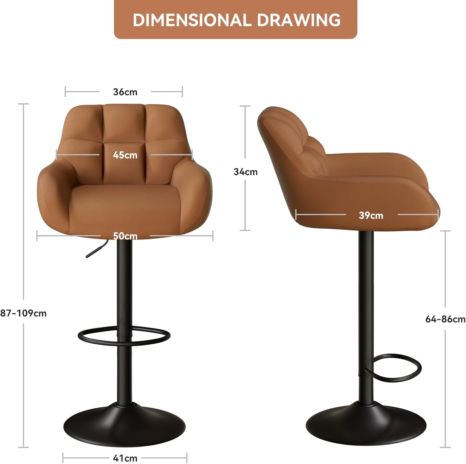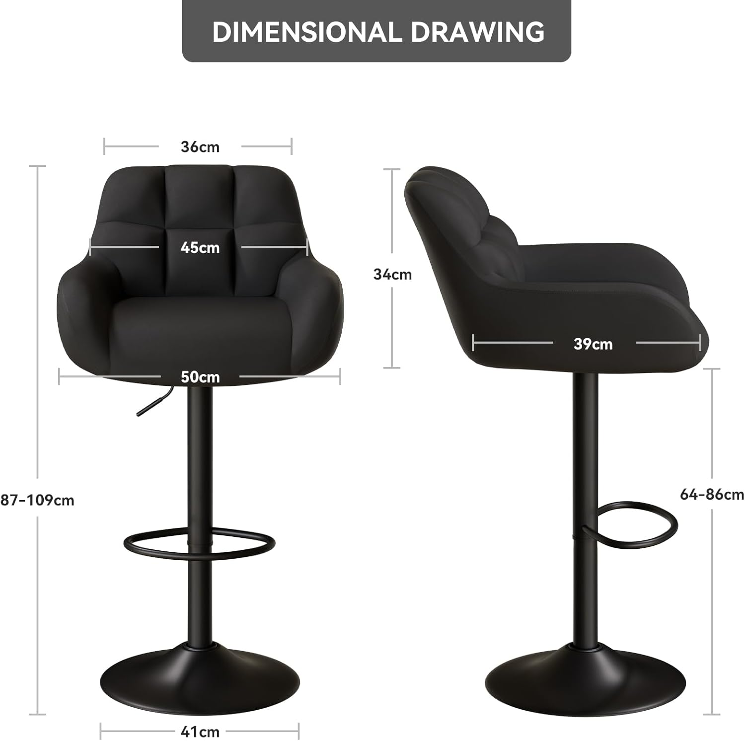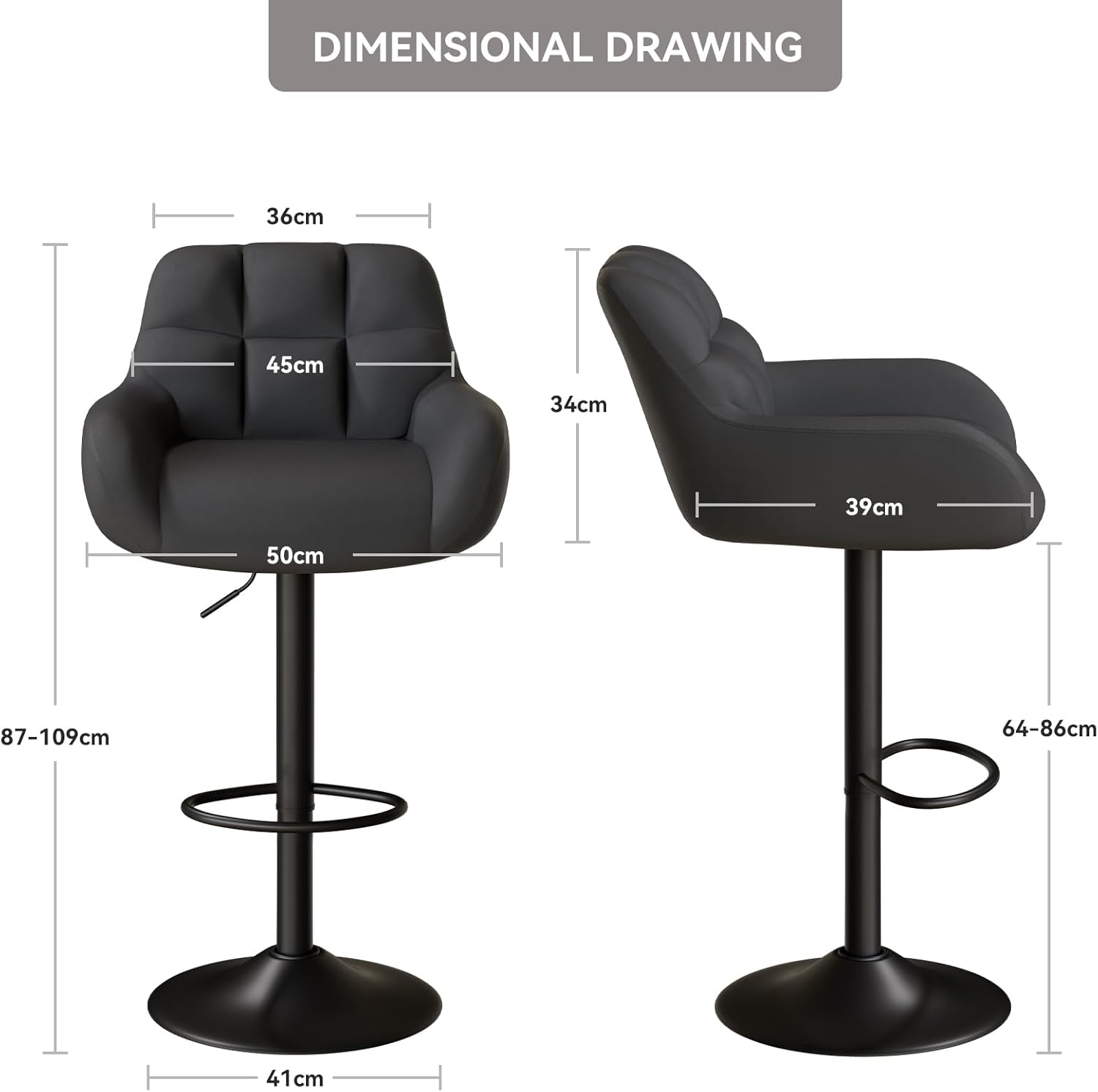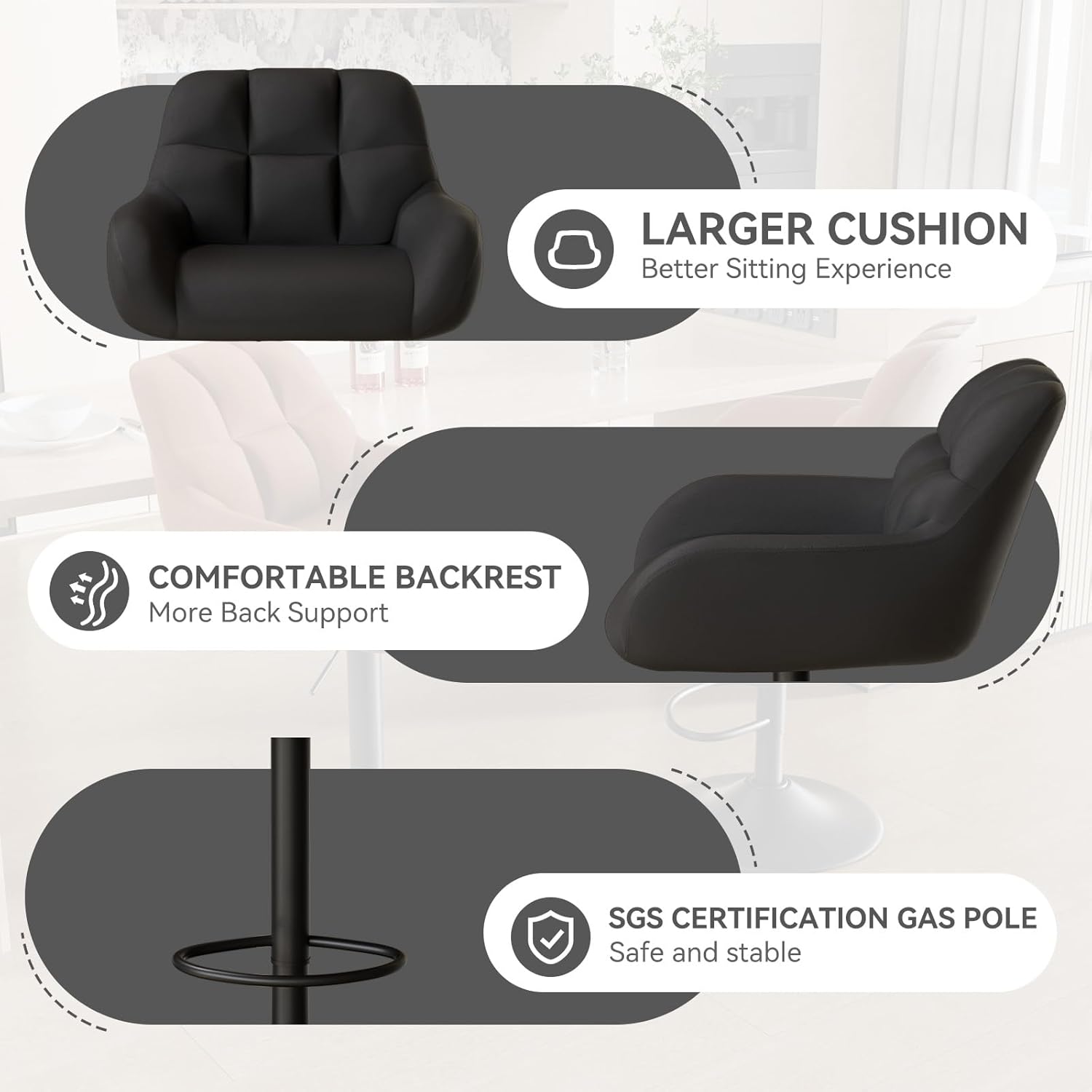 - 📏 Adjustable seat height from **65 cm to 85 cm (25.6”–33.5”)** — fits counters 36”–42” high
