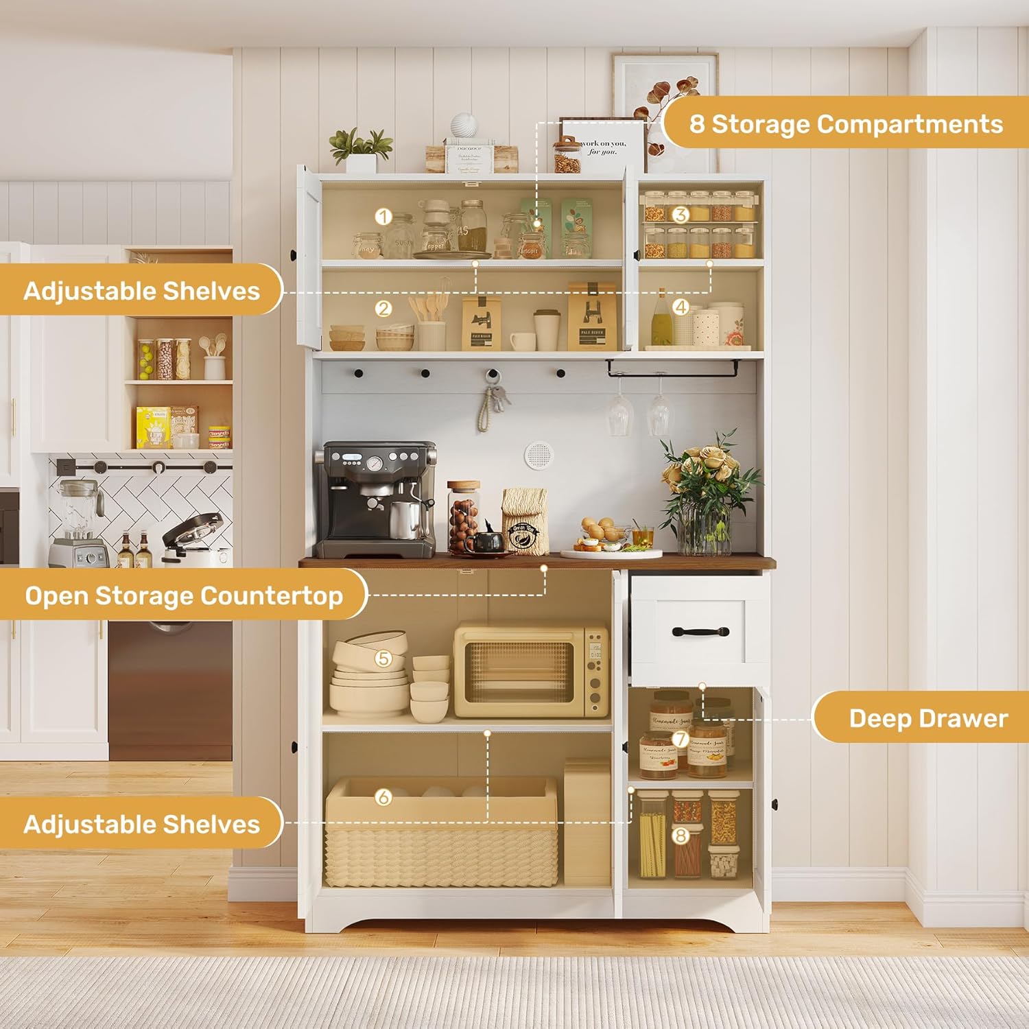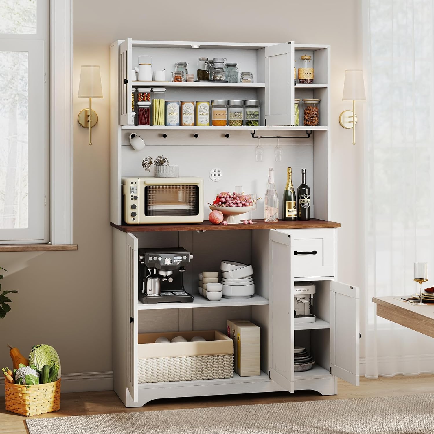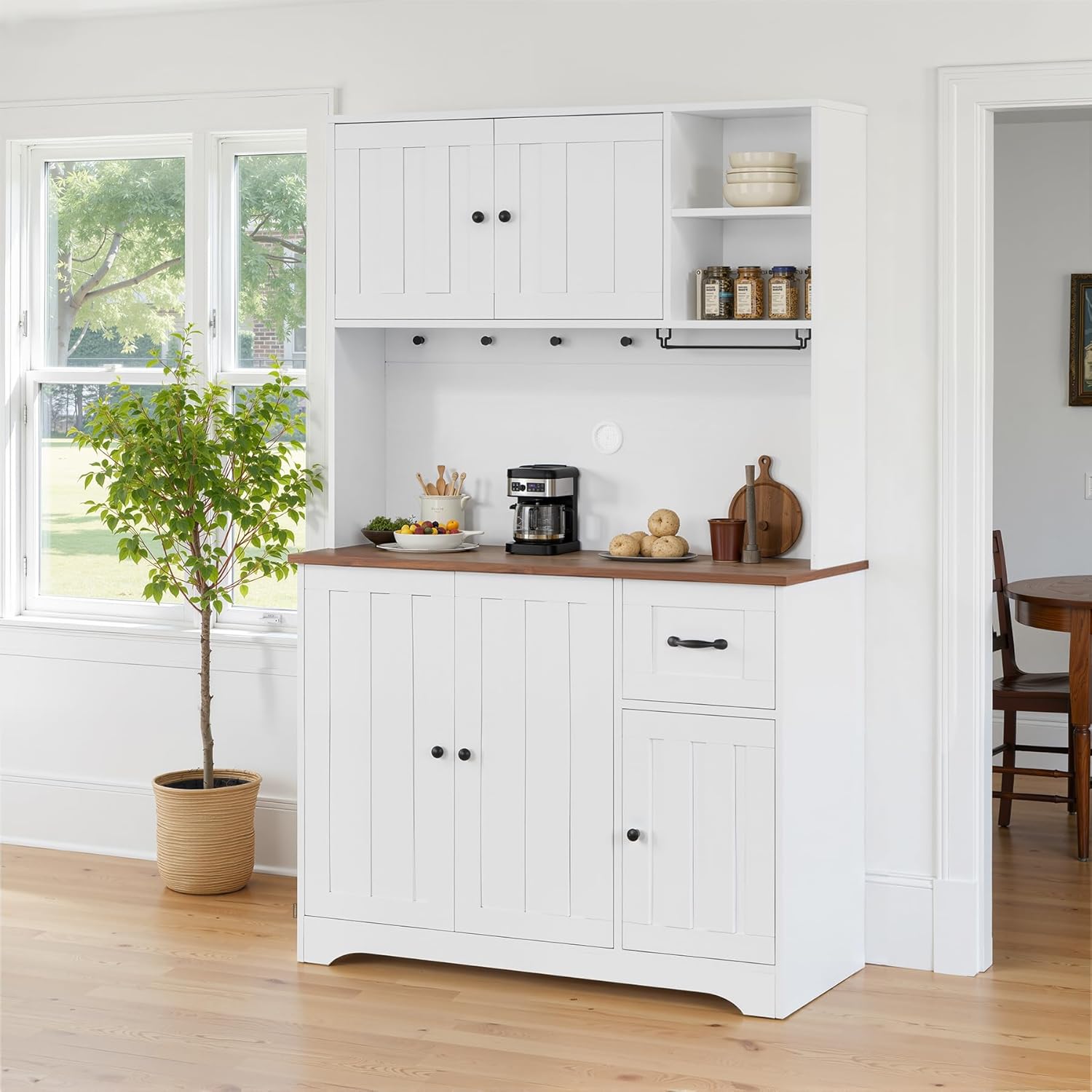 Bring charm and serious storage power to your kitchen with this elegant farmhouse pantry cabinet. Featuring a **natural wood countertop**, spacious shelving, and a sleek white finish, it’s the perfect blend of style and smart organization. ☕🏡