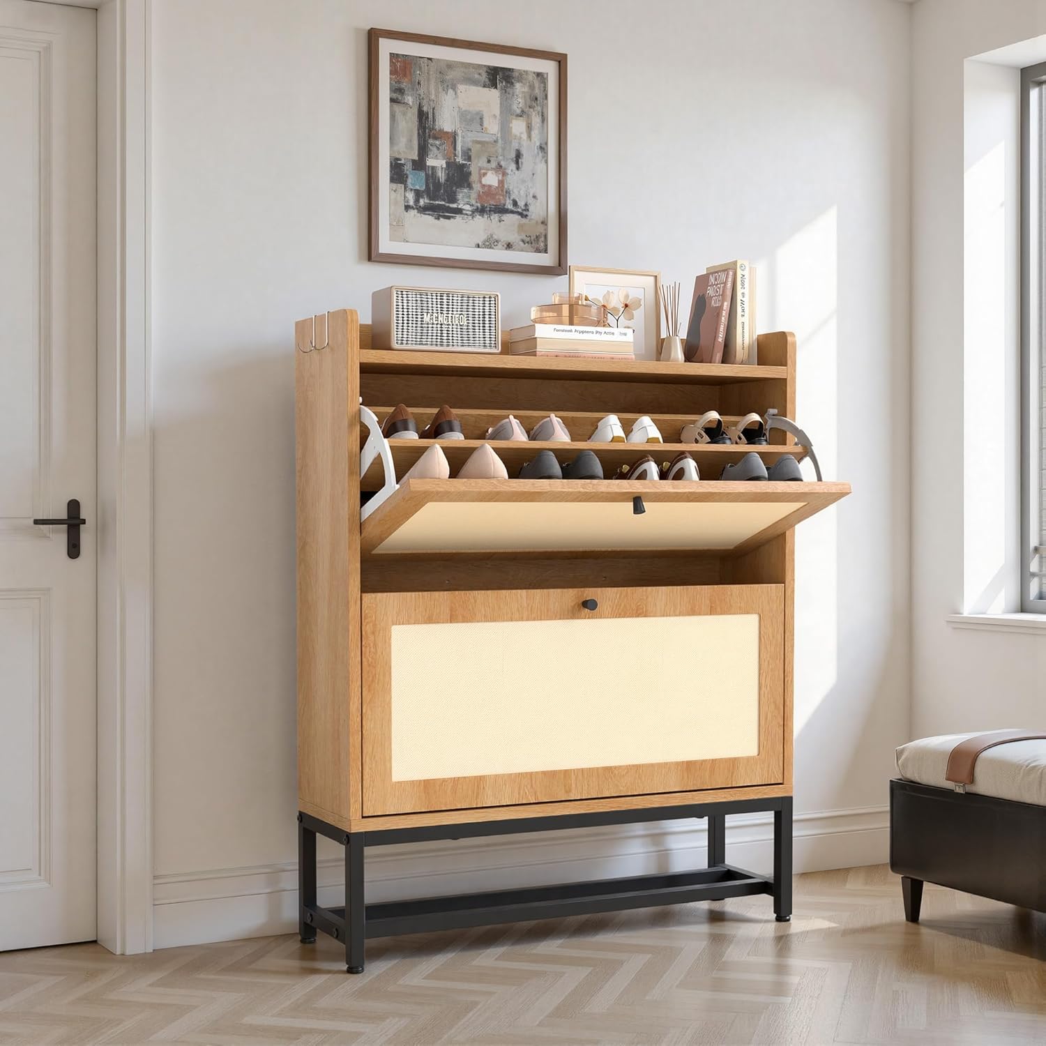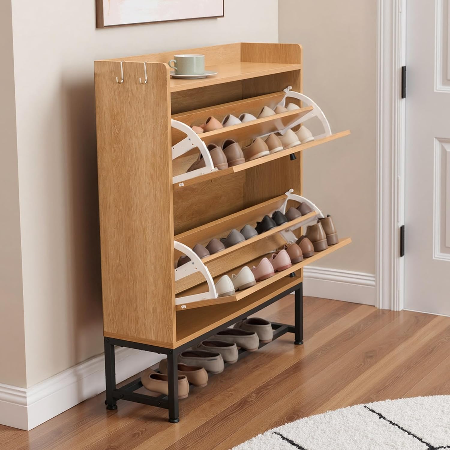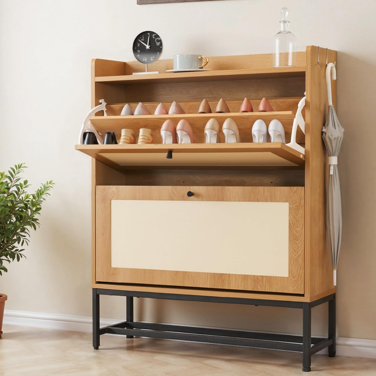 This classic flip-door shoe cabinet combines style and function. The angled front doors open smoothly, making it easy to grab or stash shoes — no more tripping over loose pairs! Ideal for:
