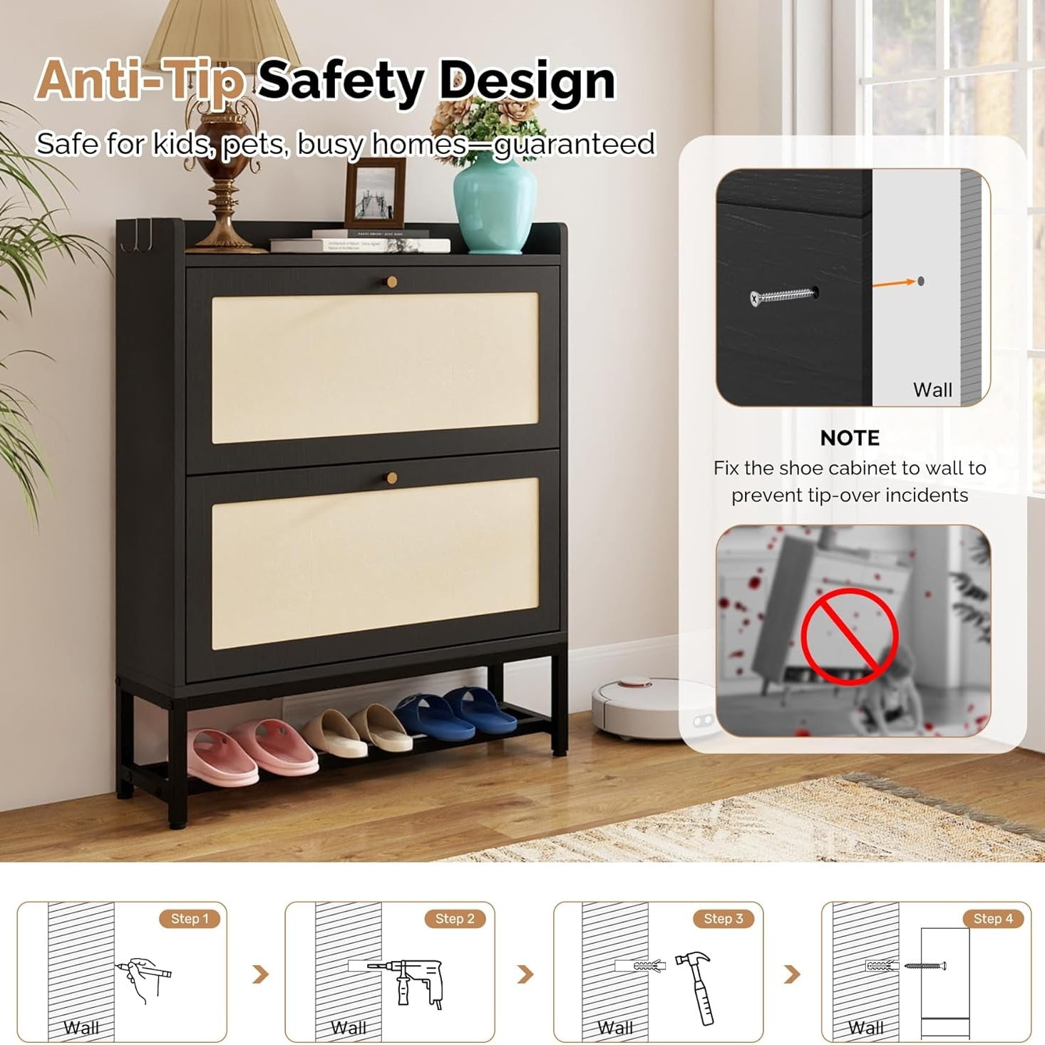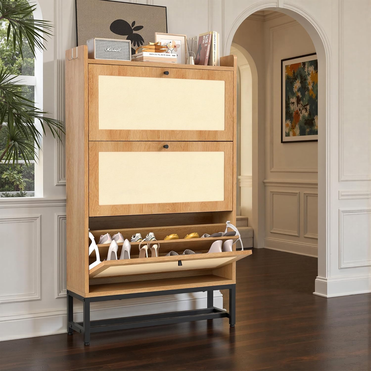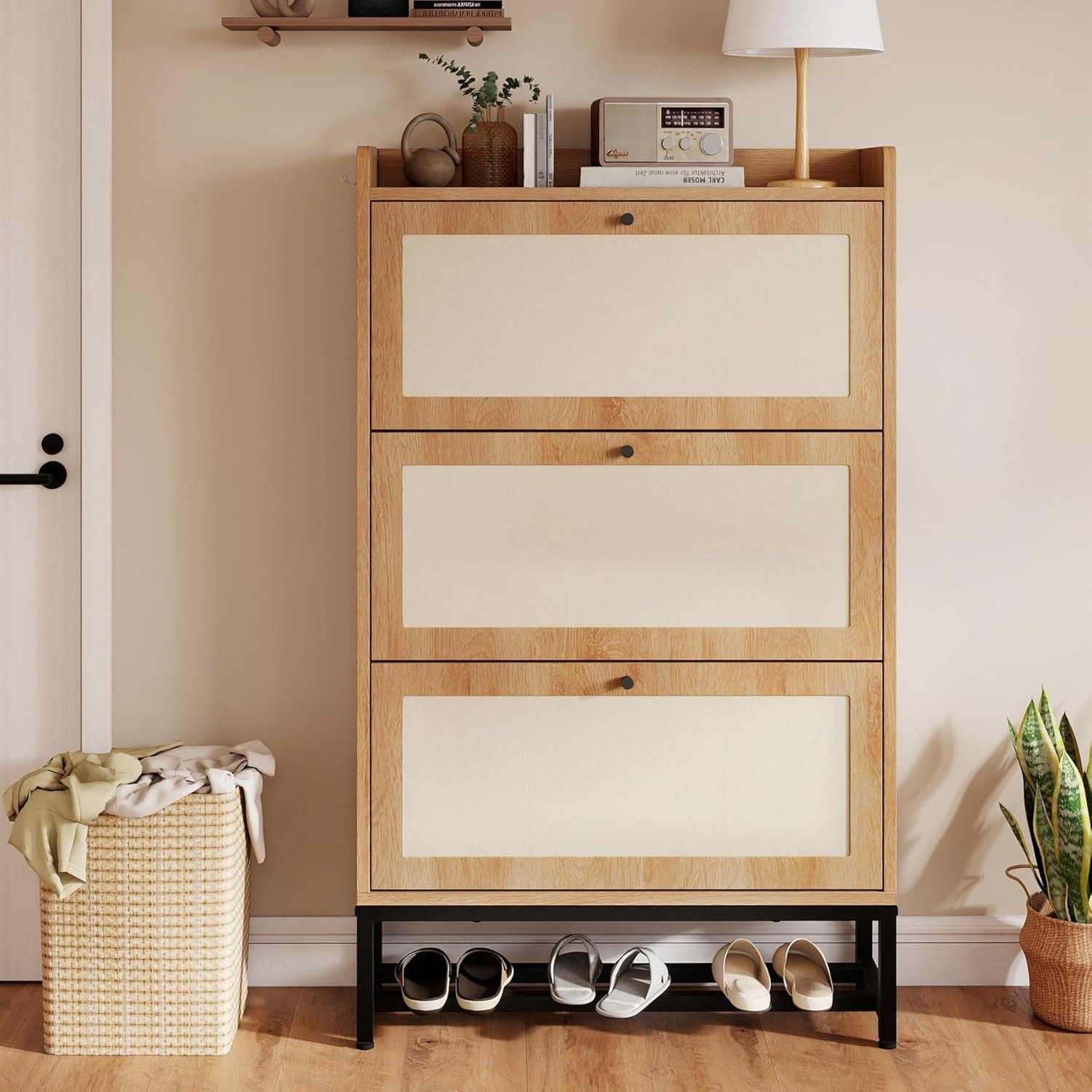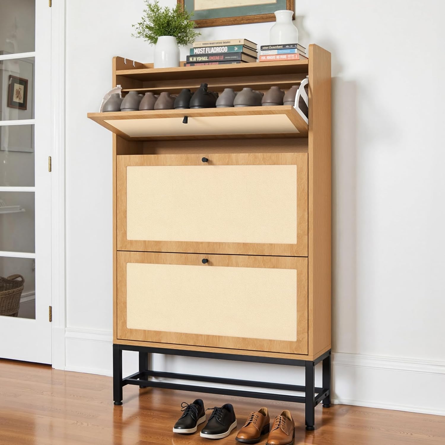 This classic flip-door shoe cabinet combines style and function. The angled front doors open smoothly, making it easy to grab or stash shoes — no more tripping over loose pairs! Ideal for: