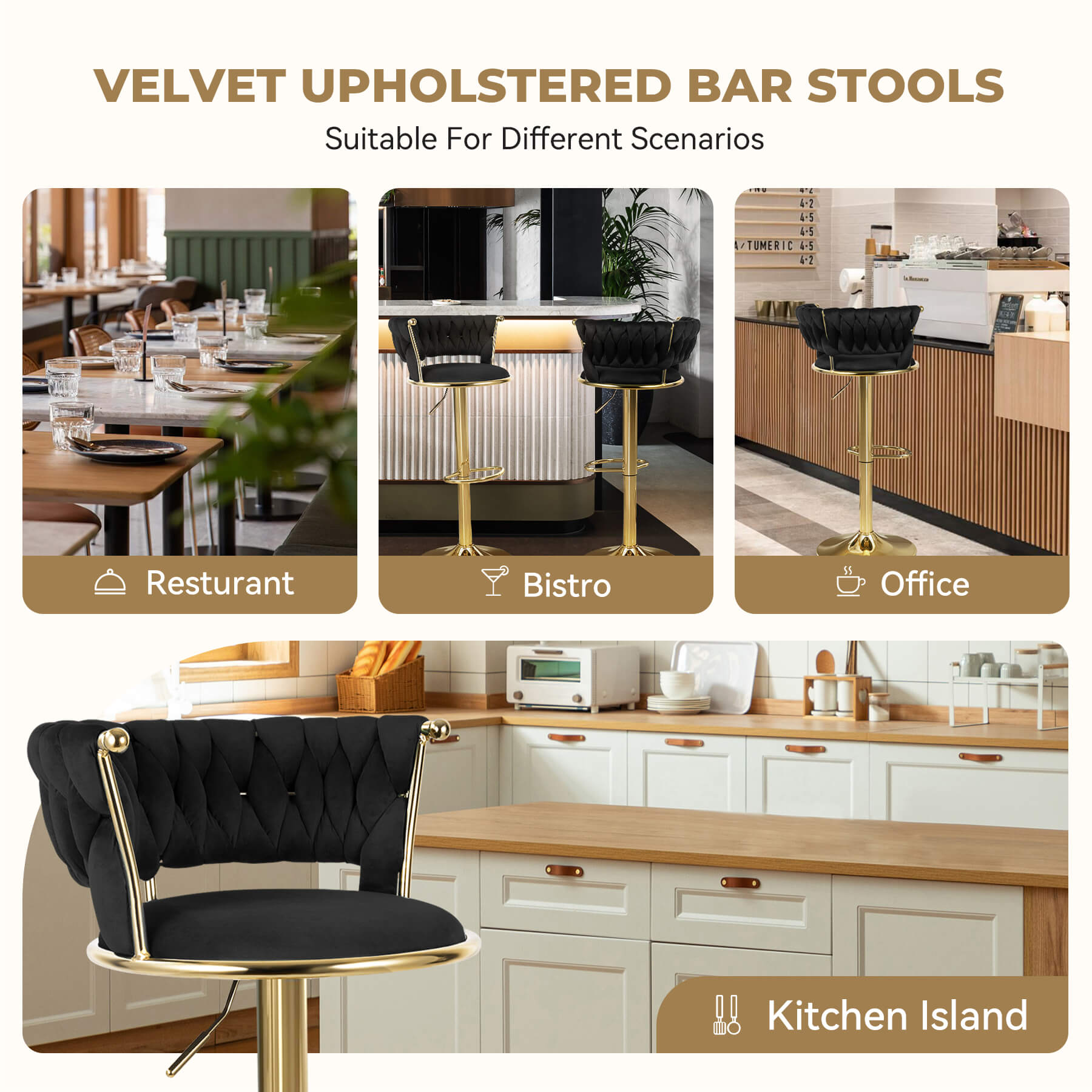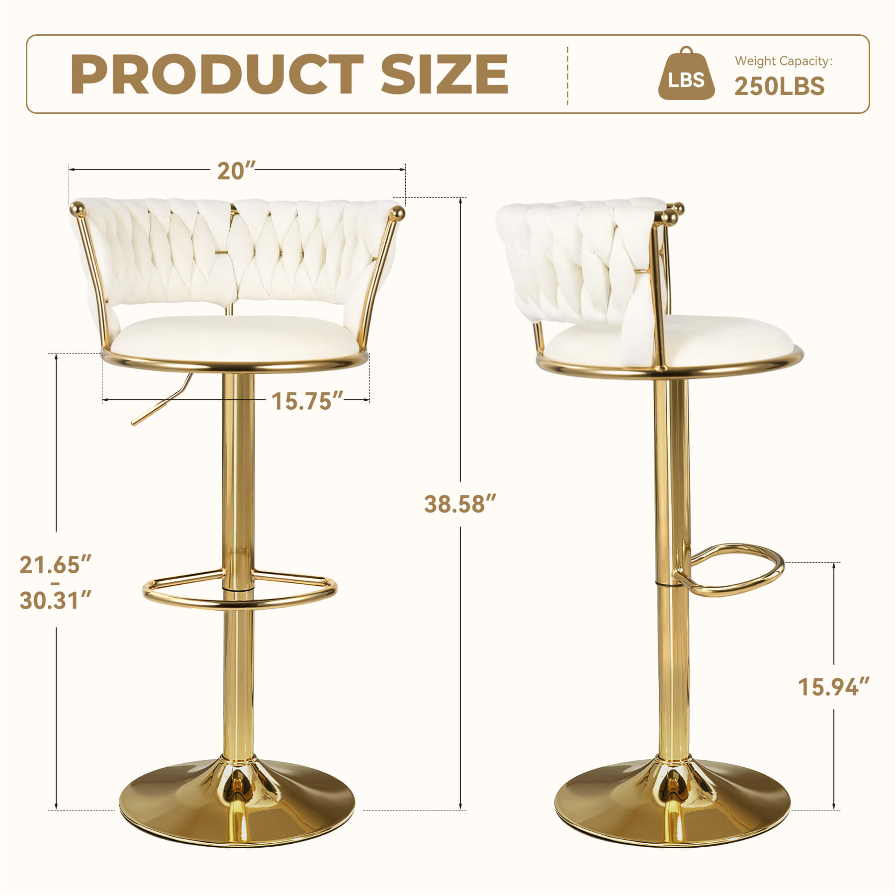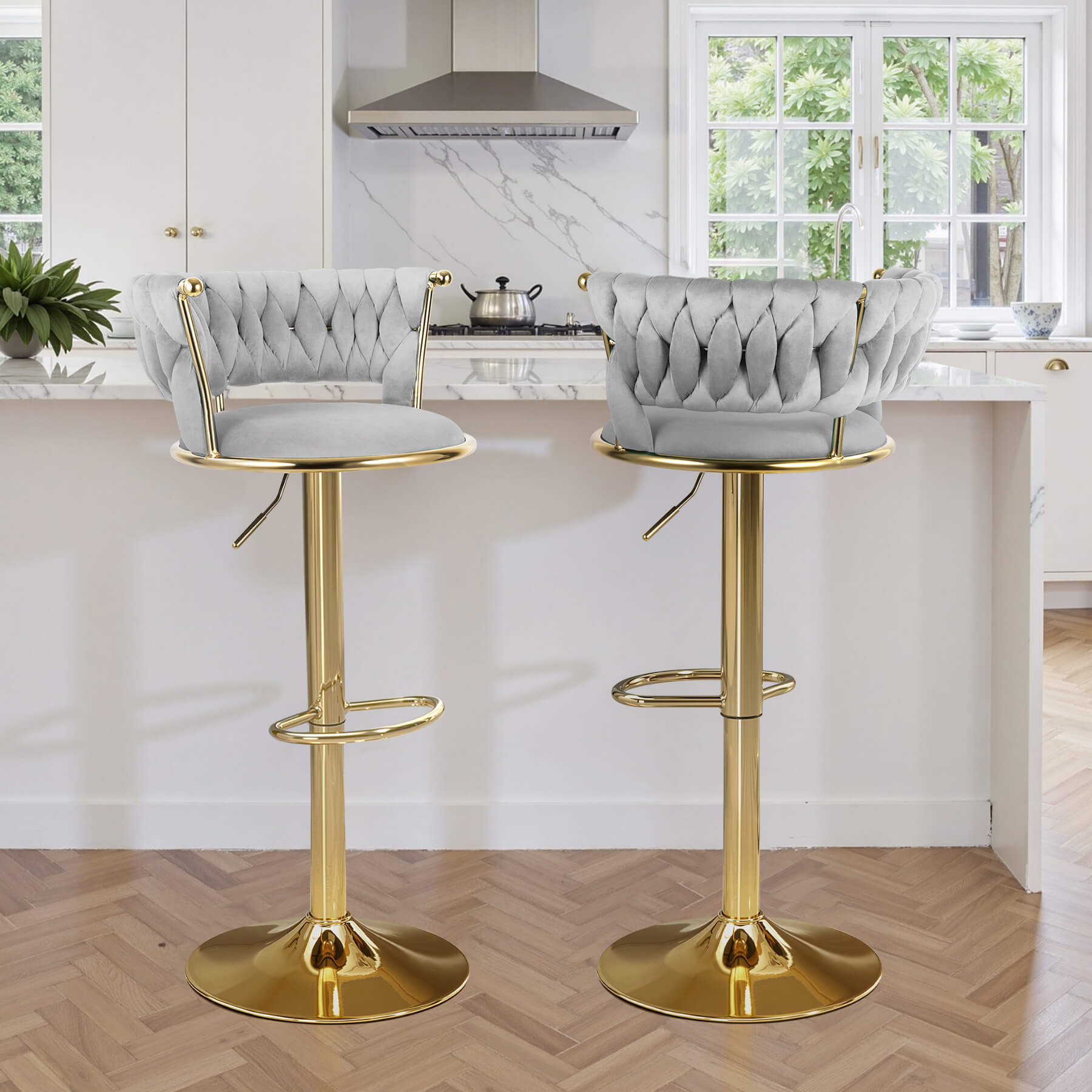 - ⚖️ Sturdy Gold Base: Wide, heavy-duty gold metal frame ensures stability and supports up to 250 lbs per stool. Non-slip rubber floor pads protect hardwood, tile, and laminate.